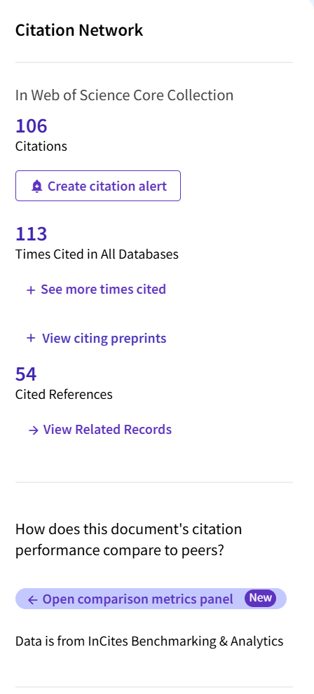 Citation Benchmarking Percentile: shows how citations received by the document compare with the average for documents in the same publication year, normalised by subject area.