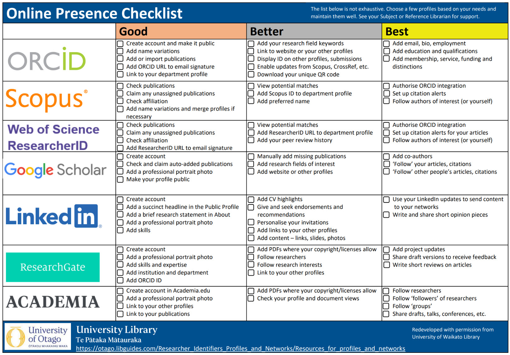 To help you get started, download the library's Online Presence Checklist. We have selected key profiles and networking sites that you might want to engage with. Use this checklist to help enhance your online presence and reach a wider audience. Depending how much time you can invest, make your online profiles "good", "better", or the "best" they can be.